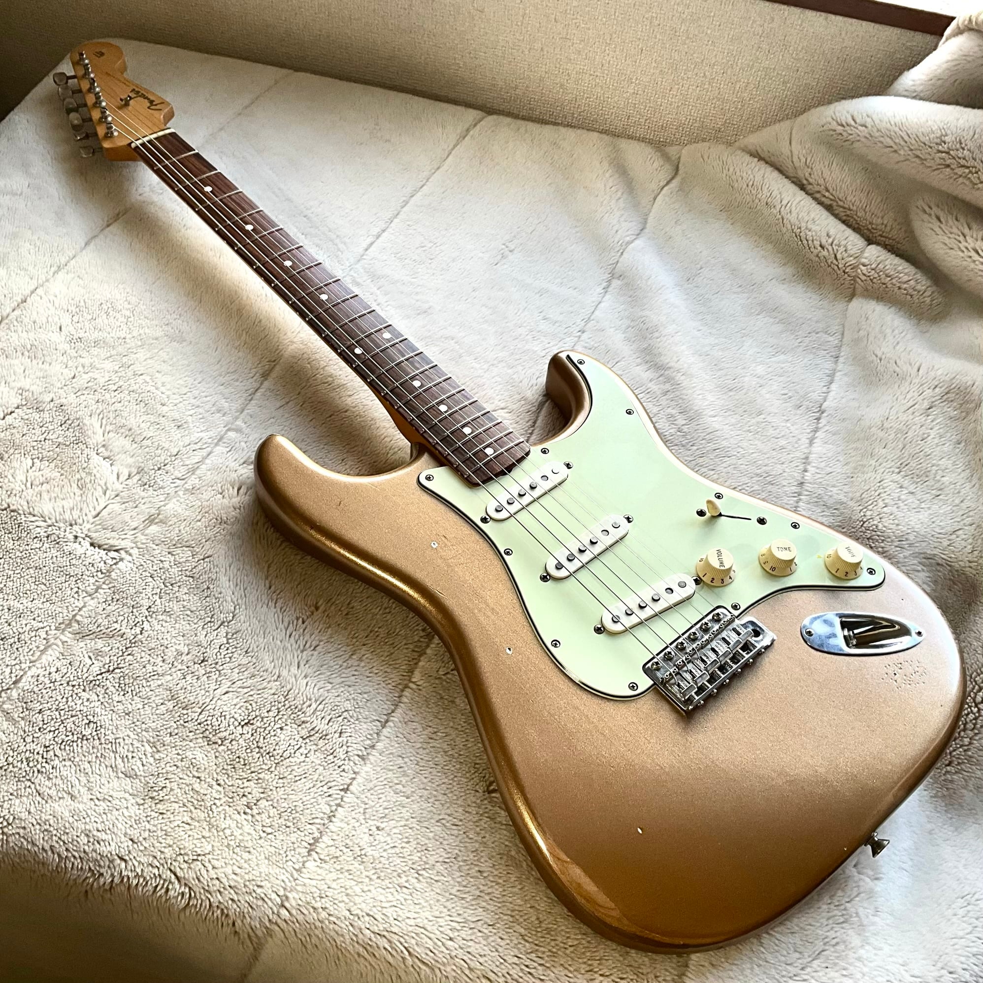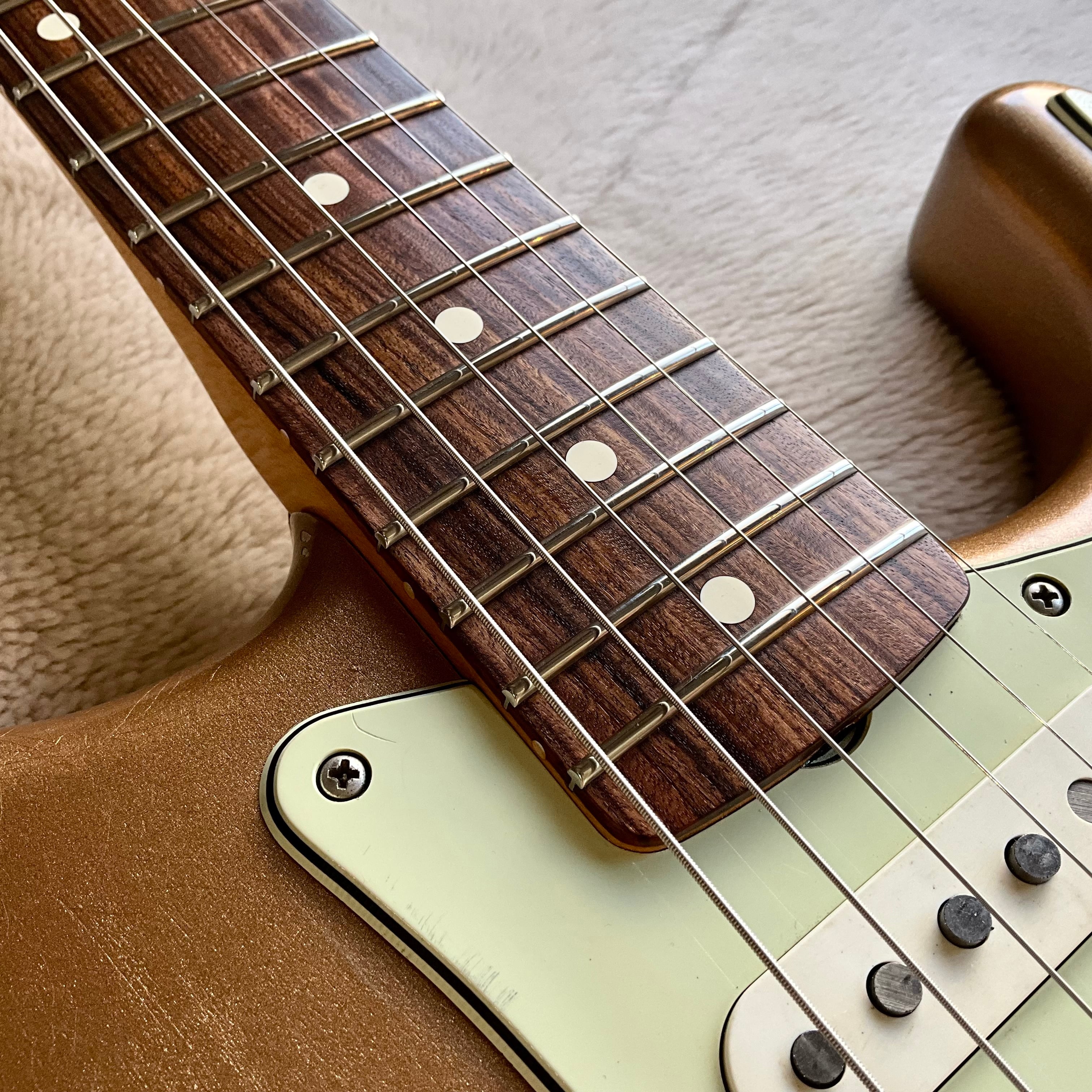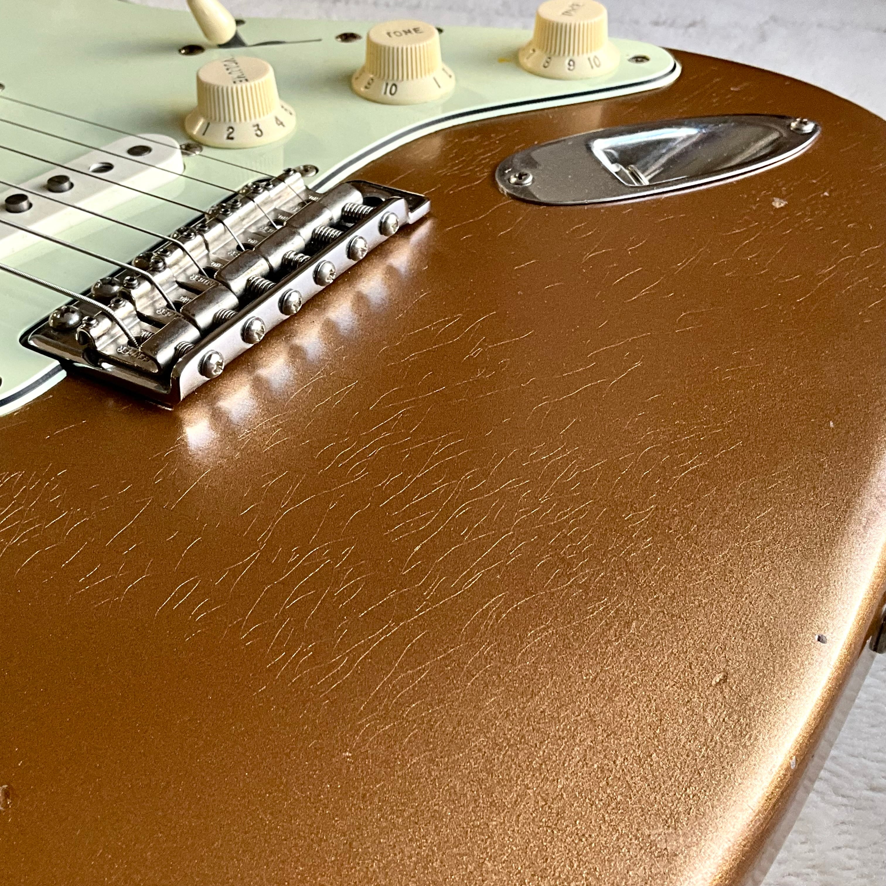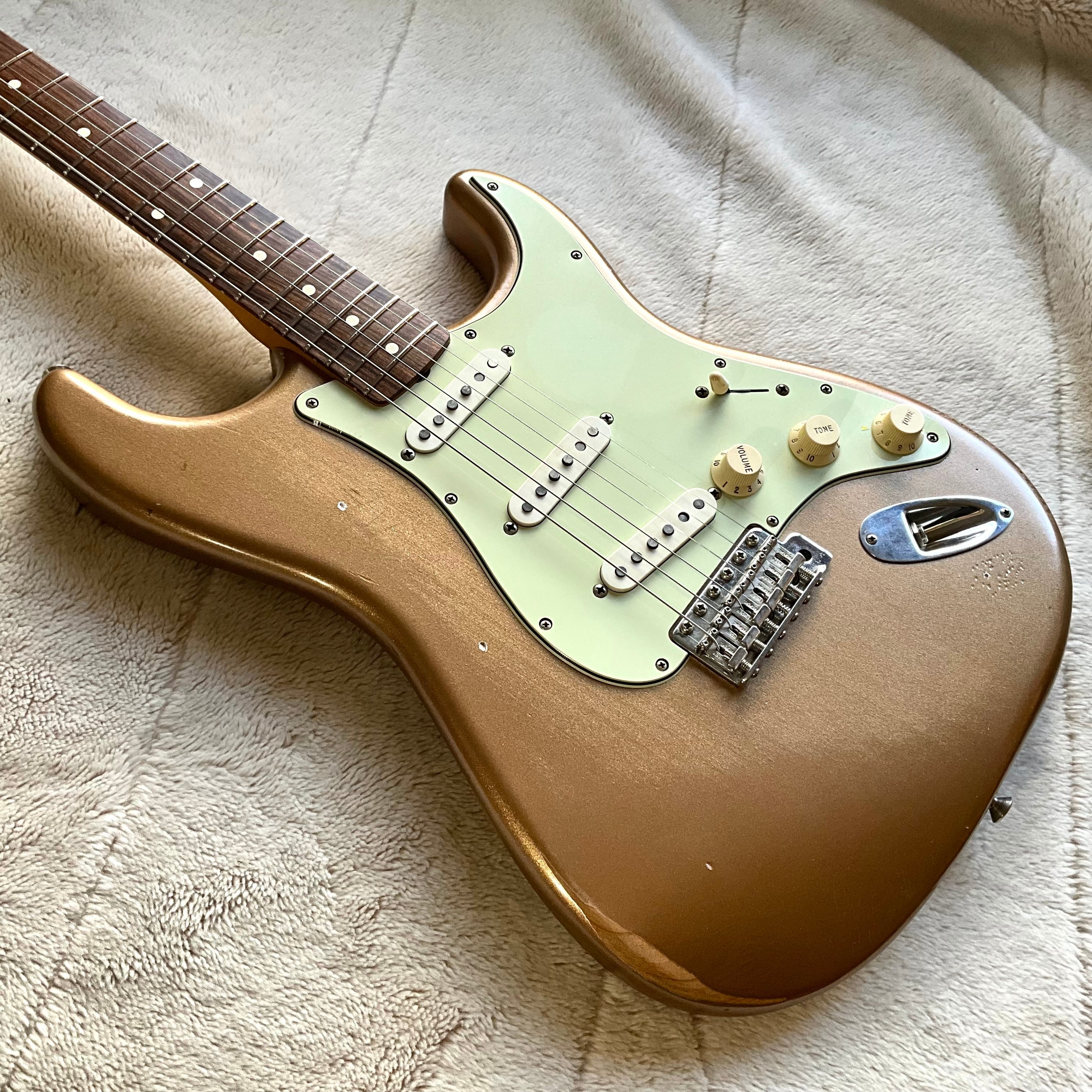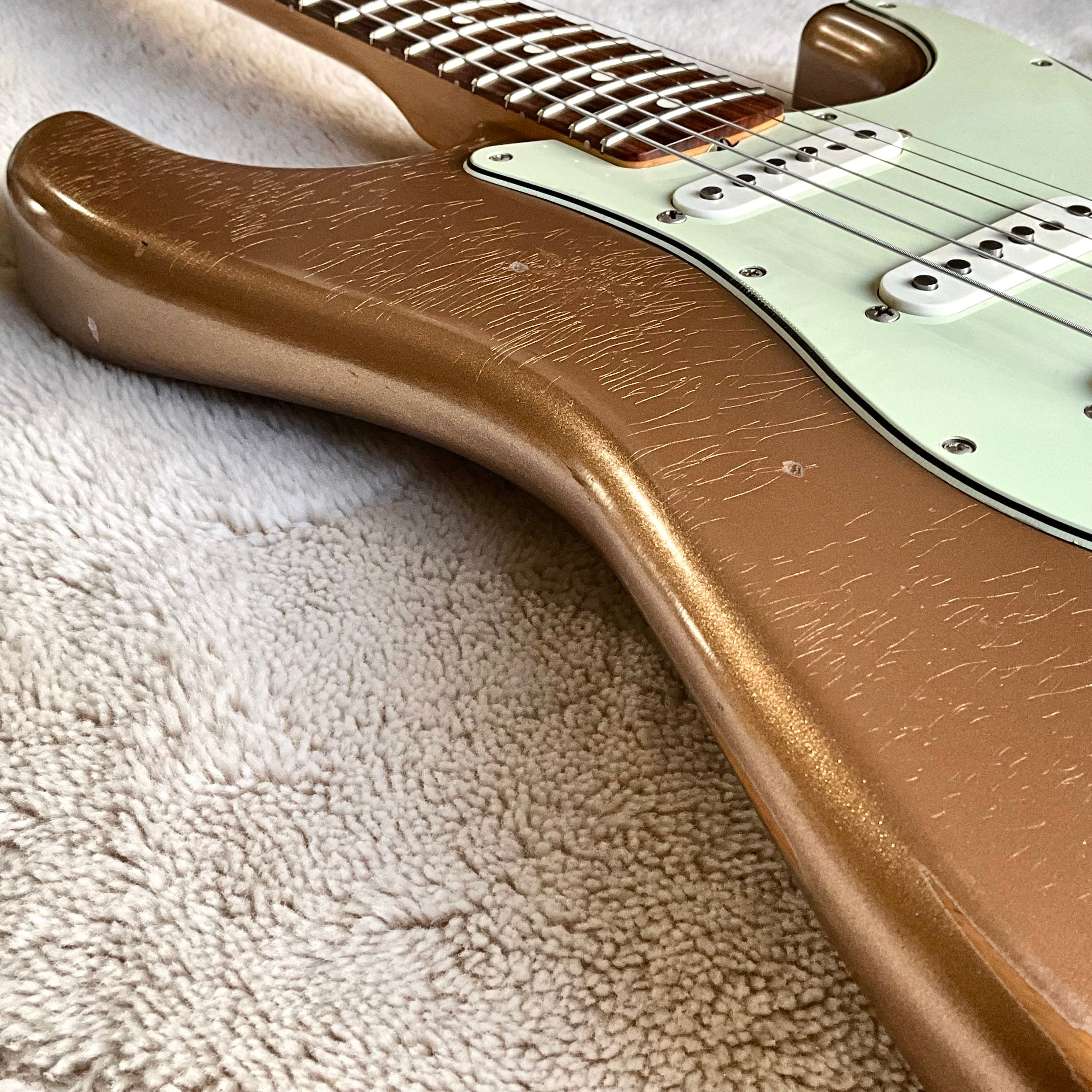ニトロセルロースラッカー塗装によるFiremist Goldカラー、明るすぎず少し褪せた雰囲気がクール!レリックもヘビーすぎず、上品なウェザーチェックと適度なヤレ具合がグッジョブです◎