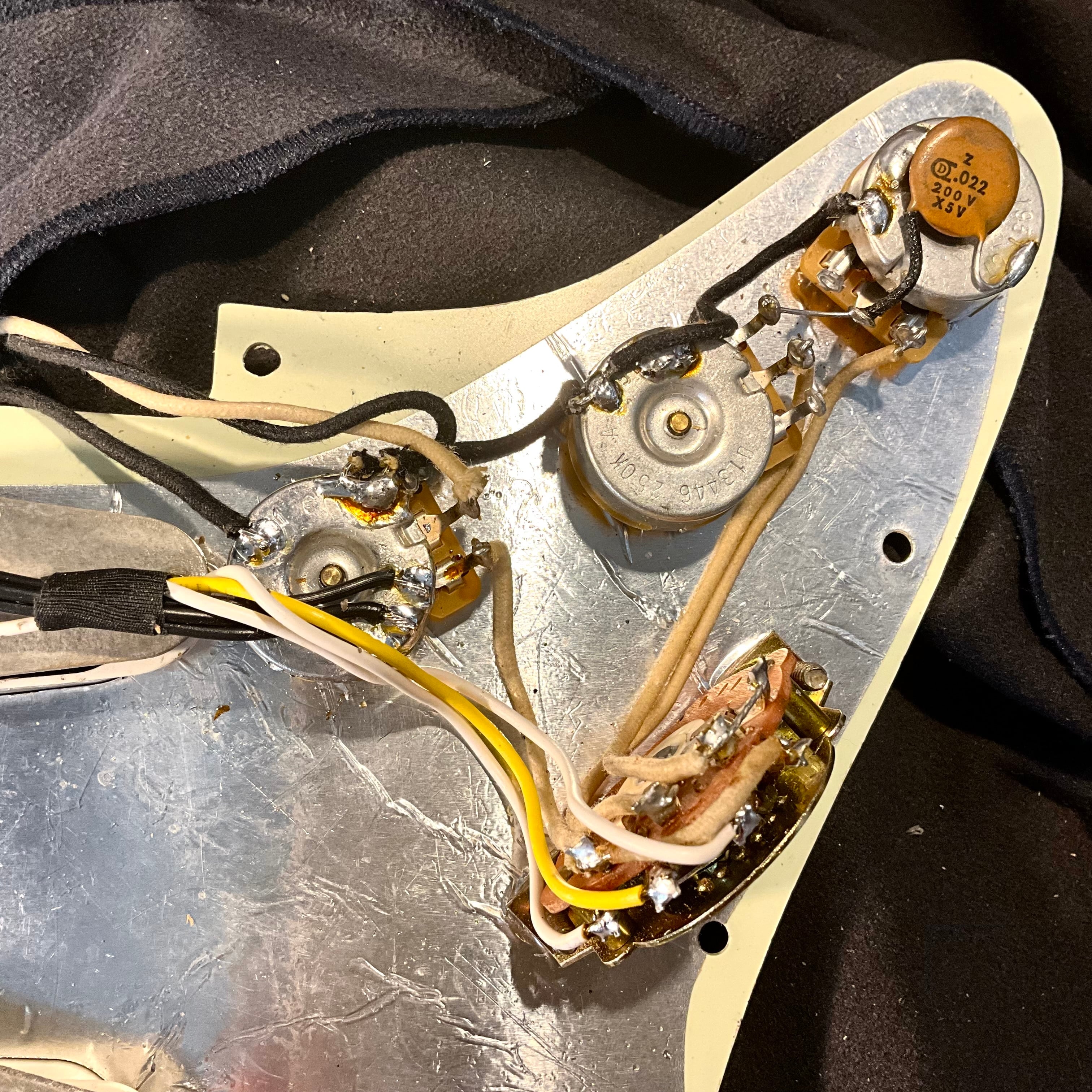 サウンドのモヤっと感の強いMEXオリジナルのゴム皮膜配線材を除去して、Gavitt製クロスワイヤーを使って新たに電装系を組み上げました。