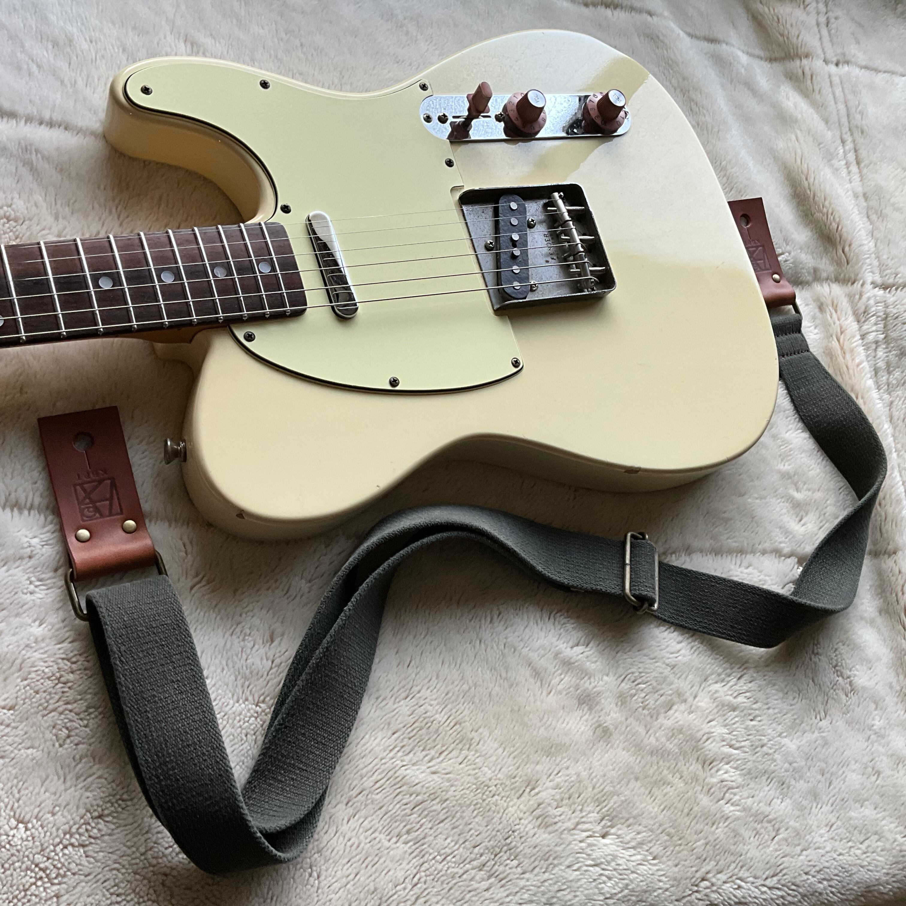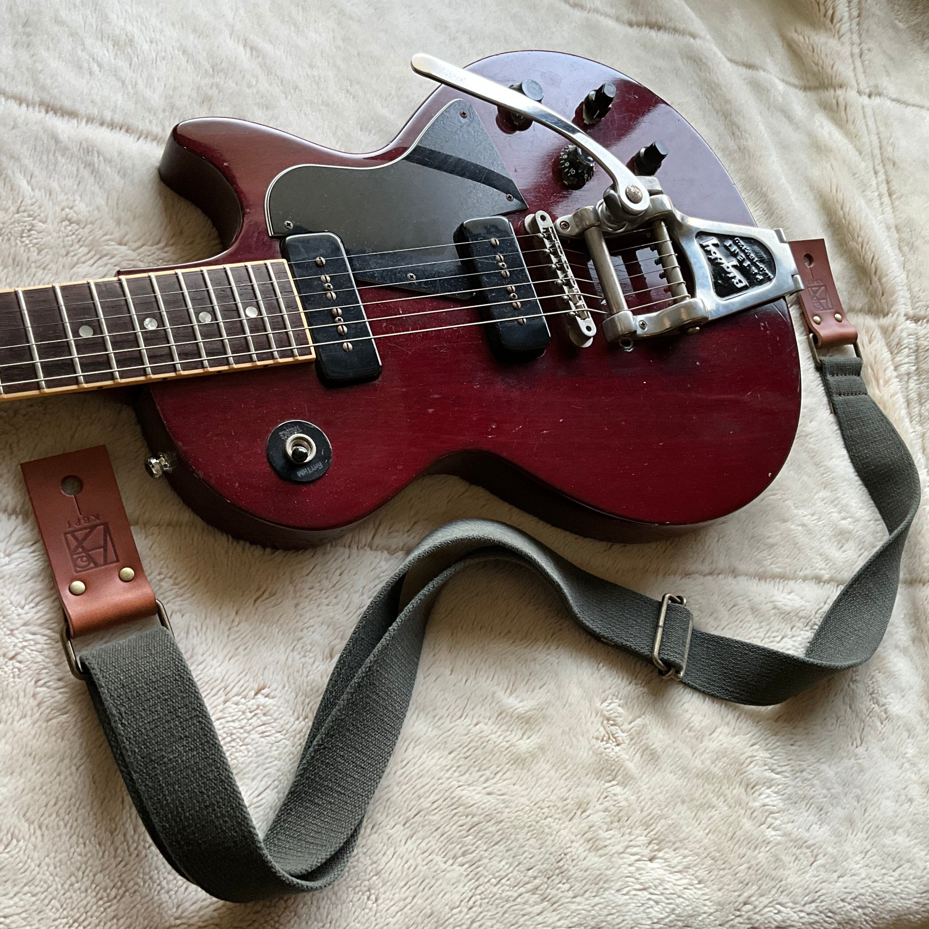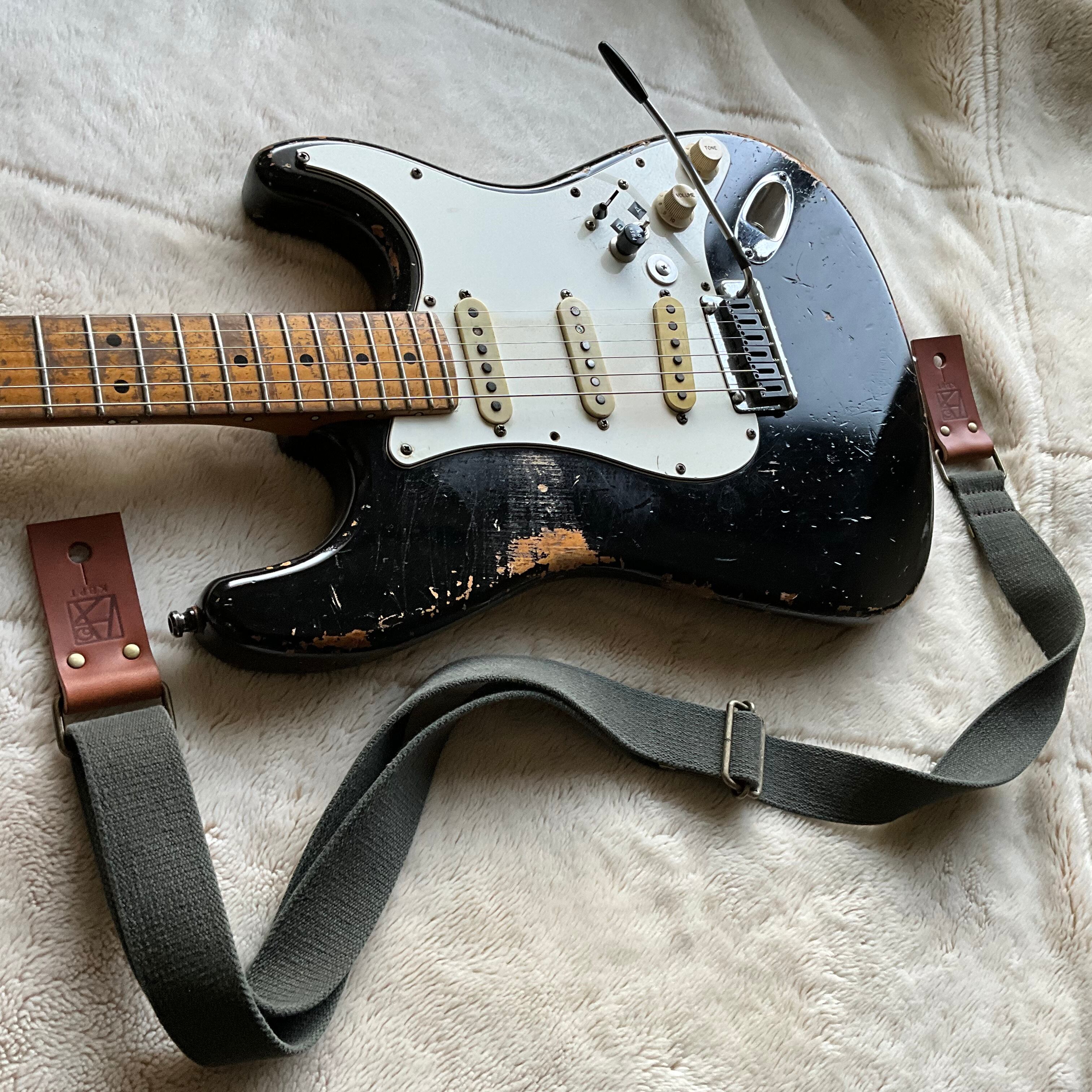 【llama40】ダークカーキ*キャメルレザー*アンティーク金具【ピン径8mm/柔らかくて厚い綿のギターストラップ/dkcma1LM】