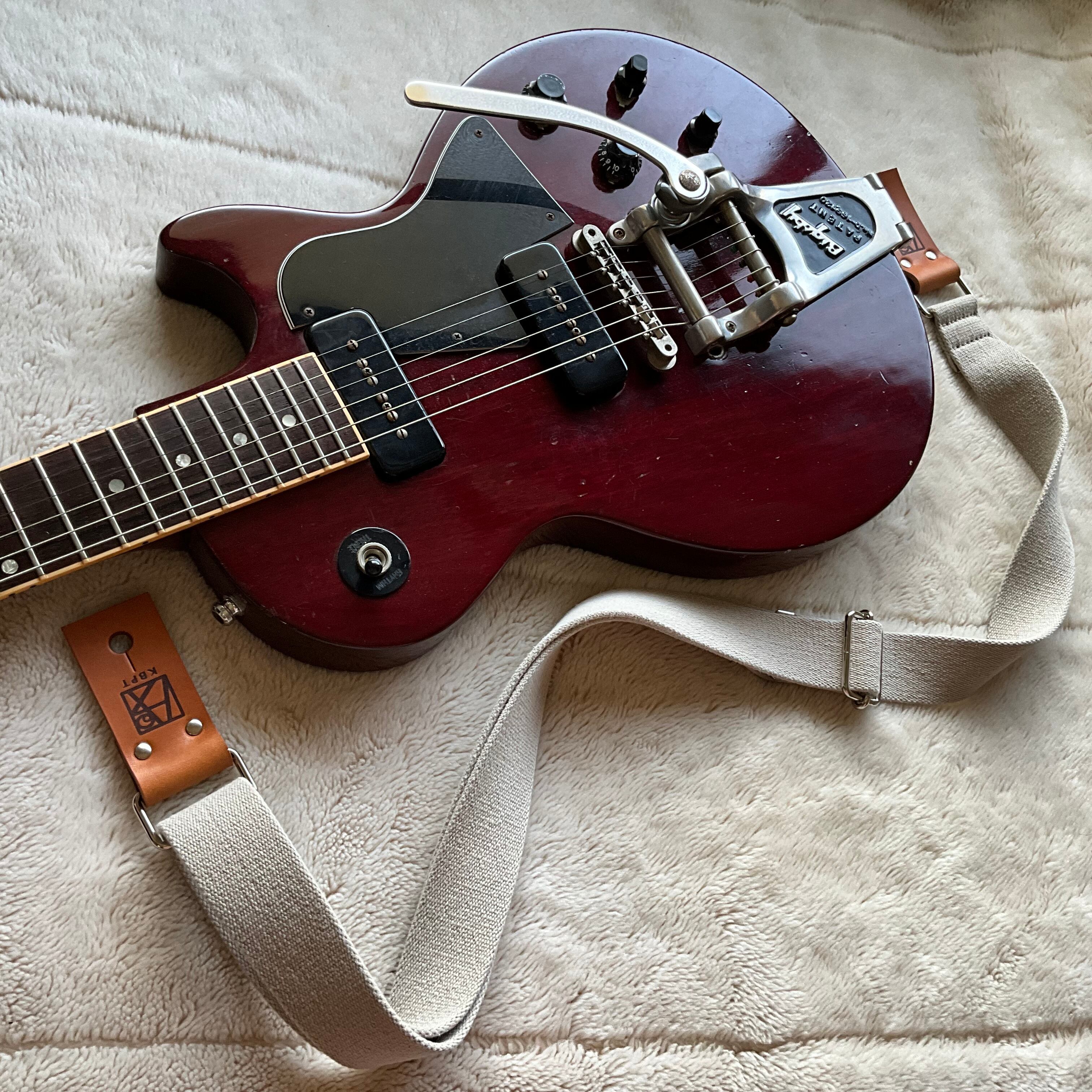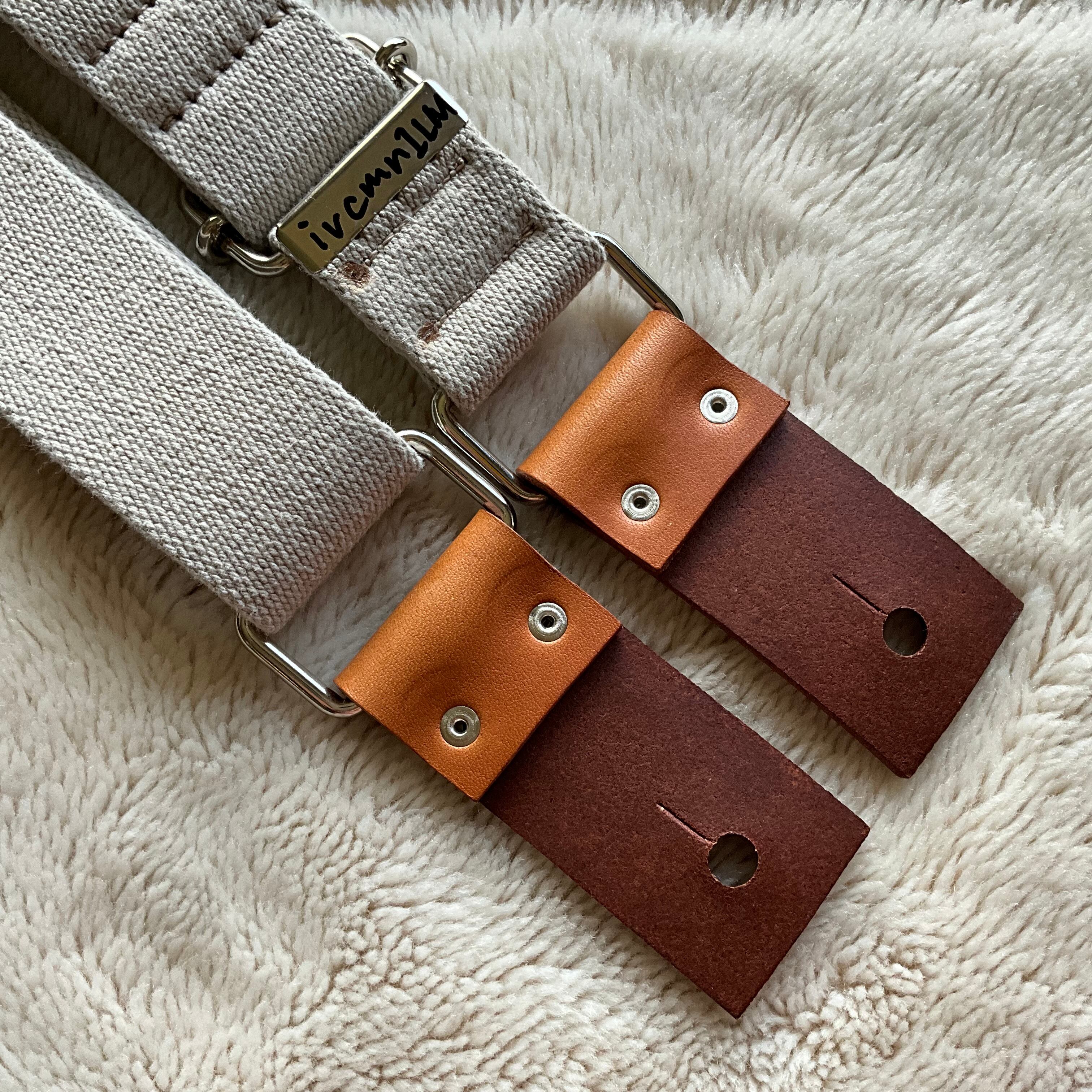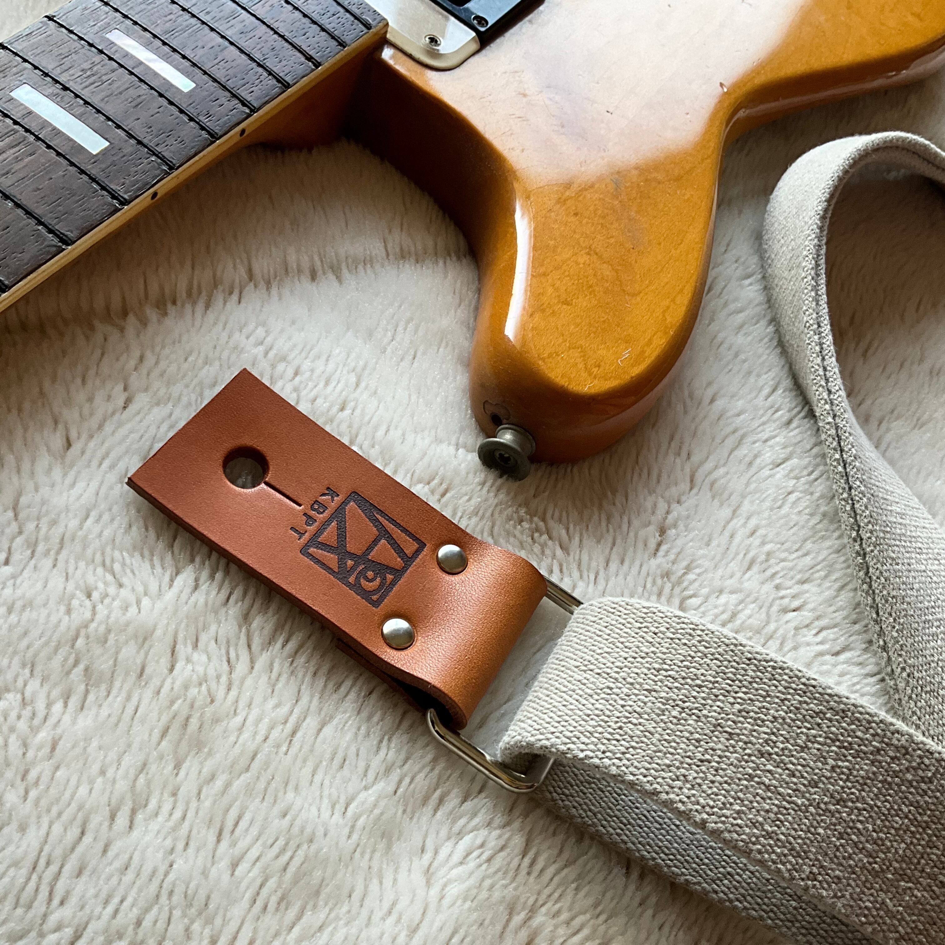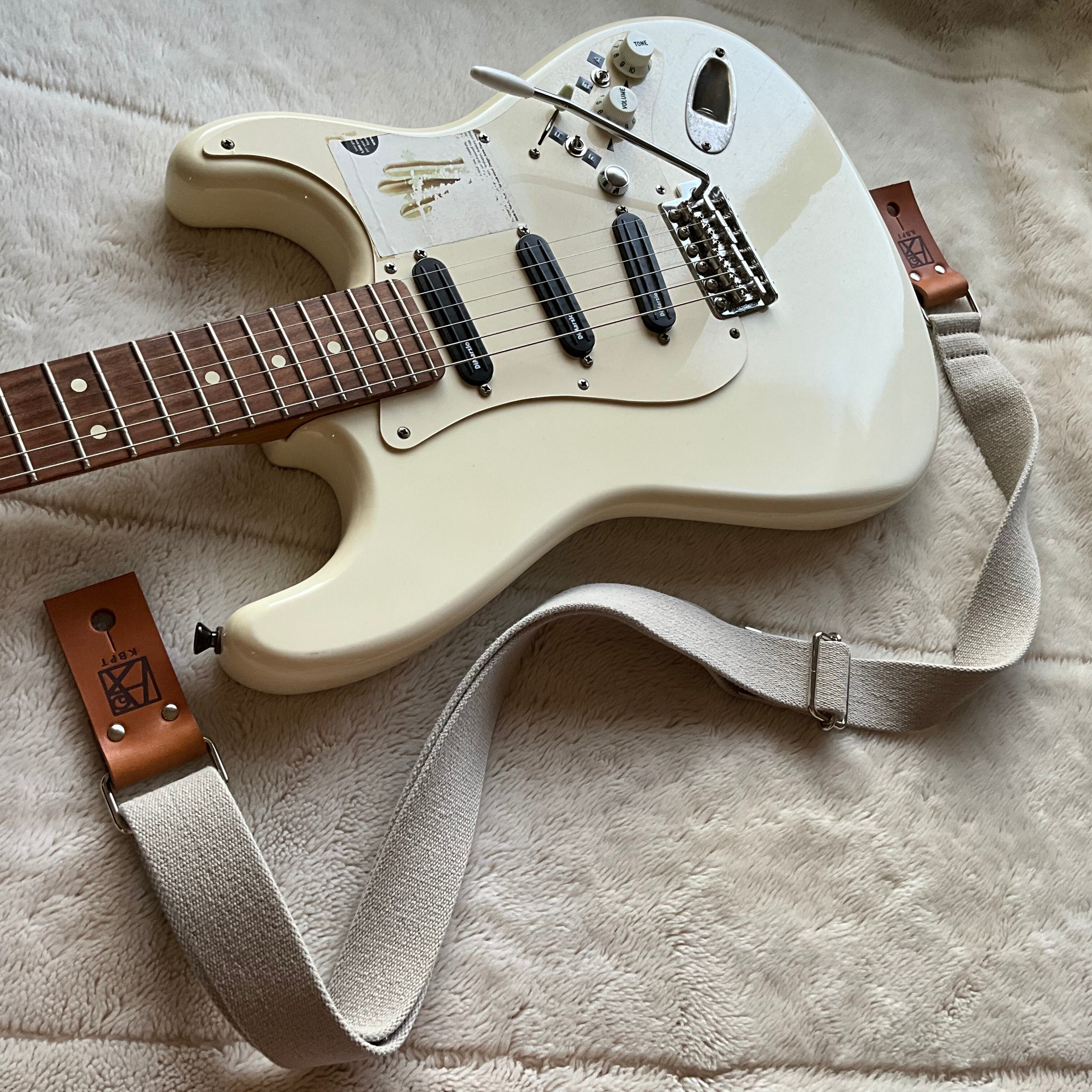 【llama40】アイボリー*キャメルレザー*ニッケル金具【ピン径8mm/柔らかくて厚い綿のギターストラップ/ivcmn1LM】