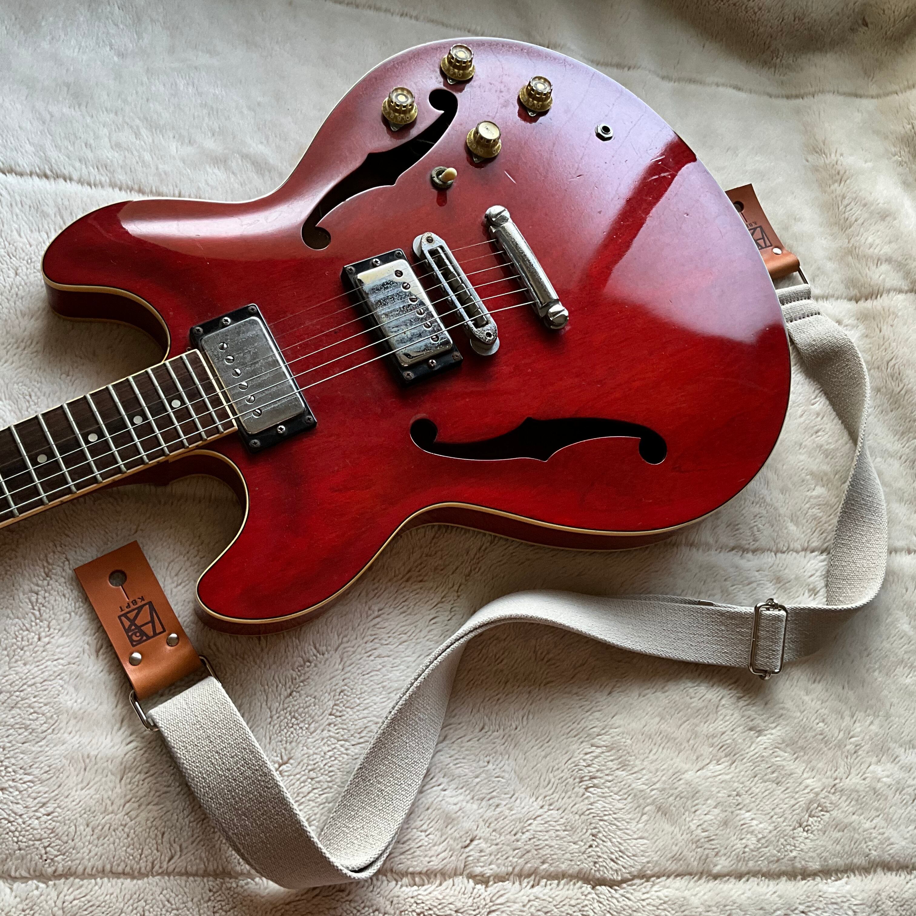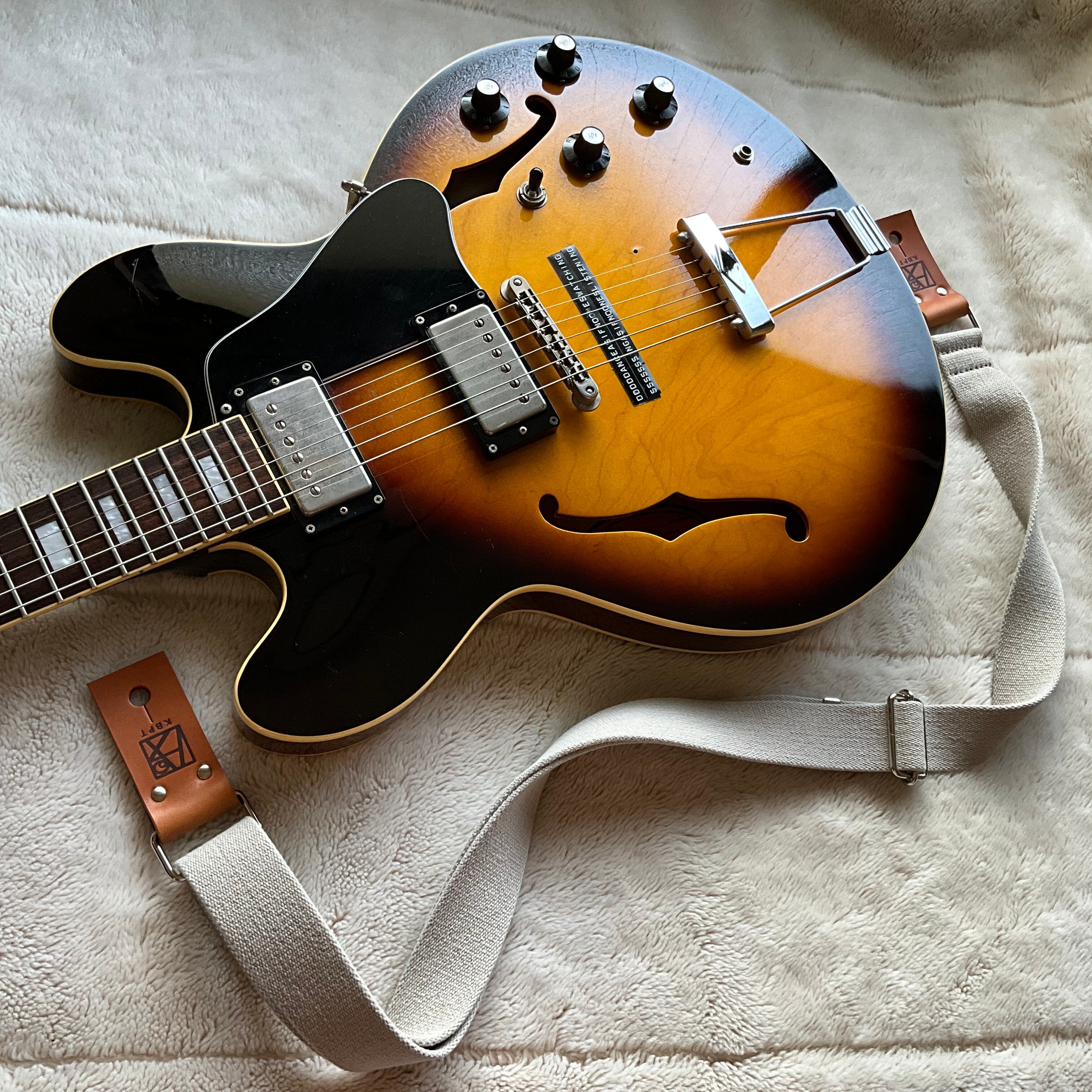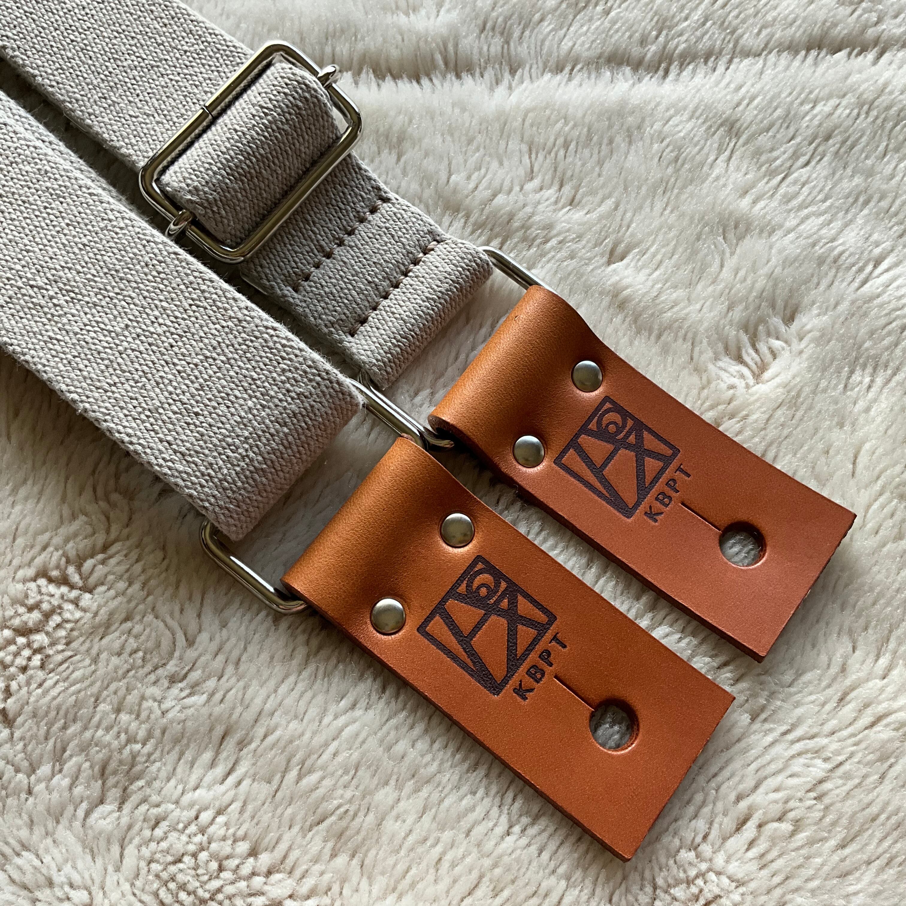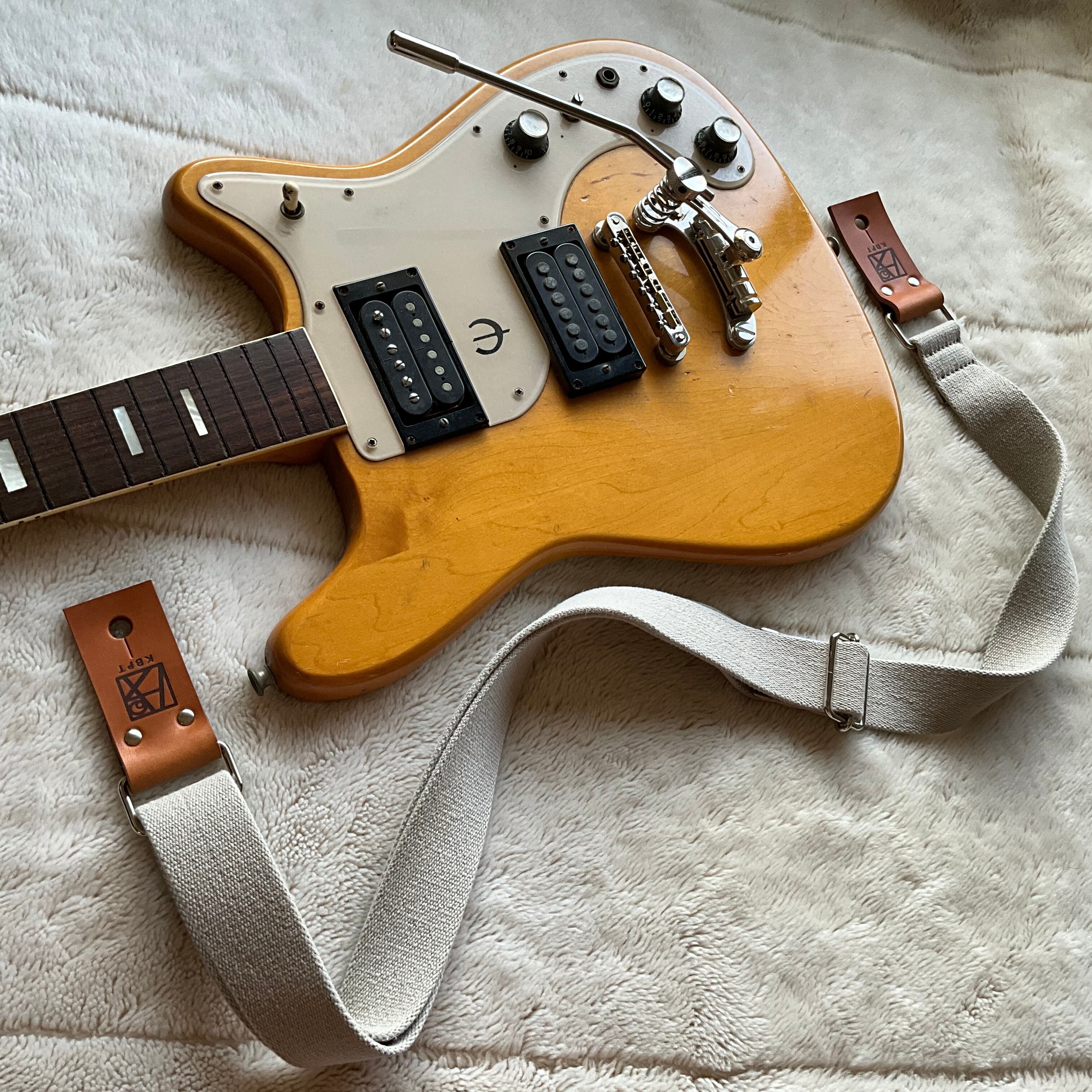 【llama40】アイボリー*キャメルレザー*ニッケル金具【ピン径8mm/柔らかくて厚い綿のギターストラップ/ivcmn1LM】
