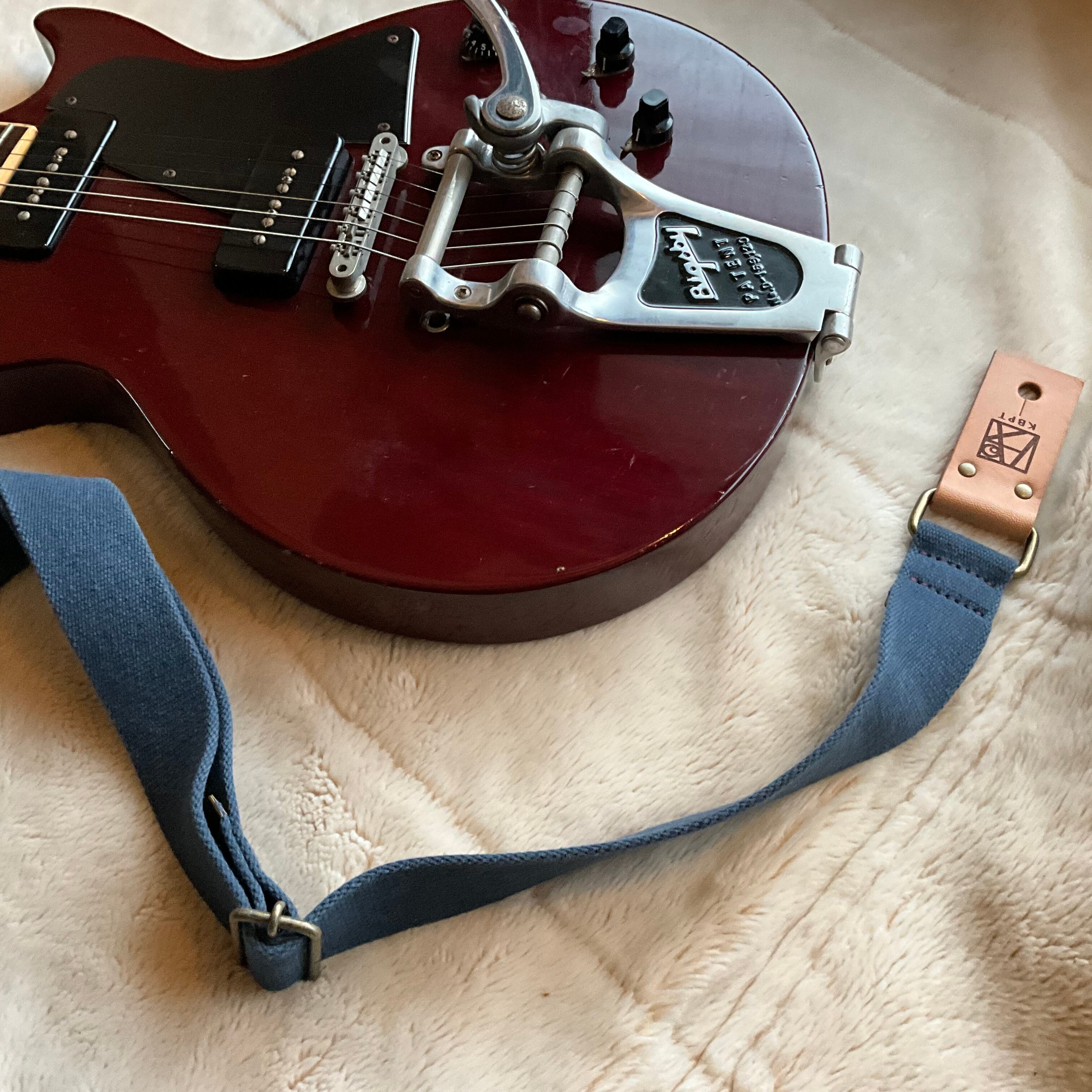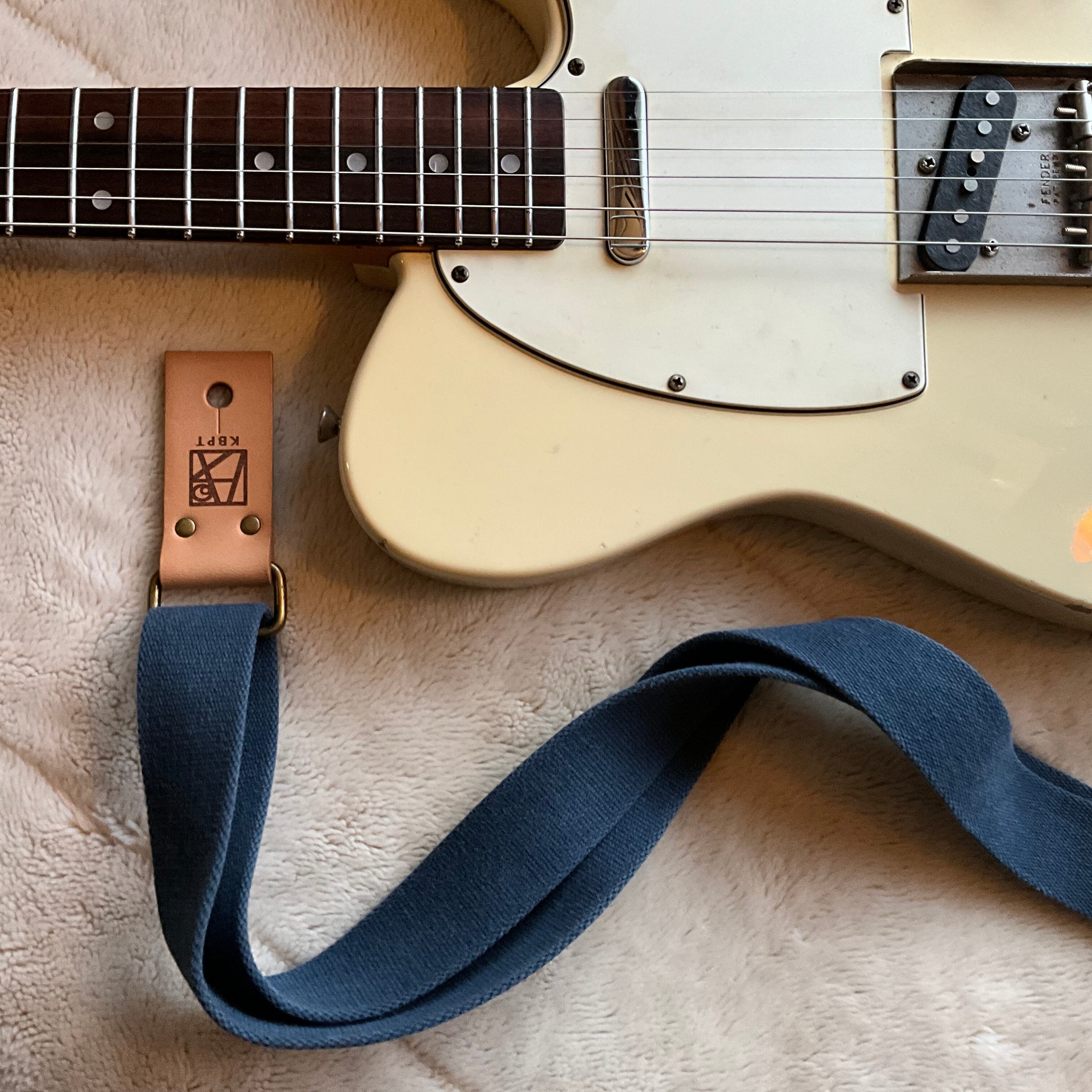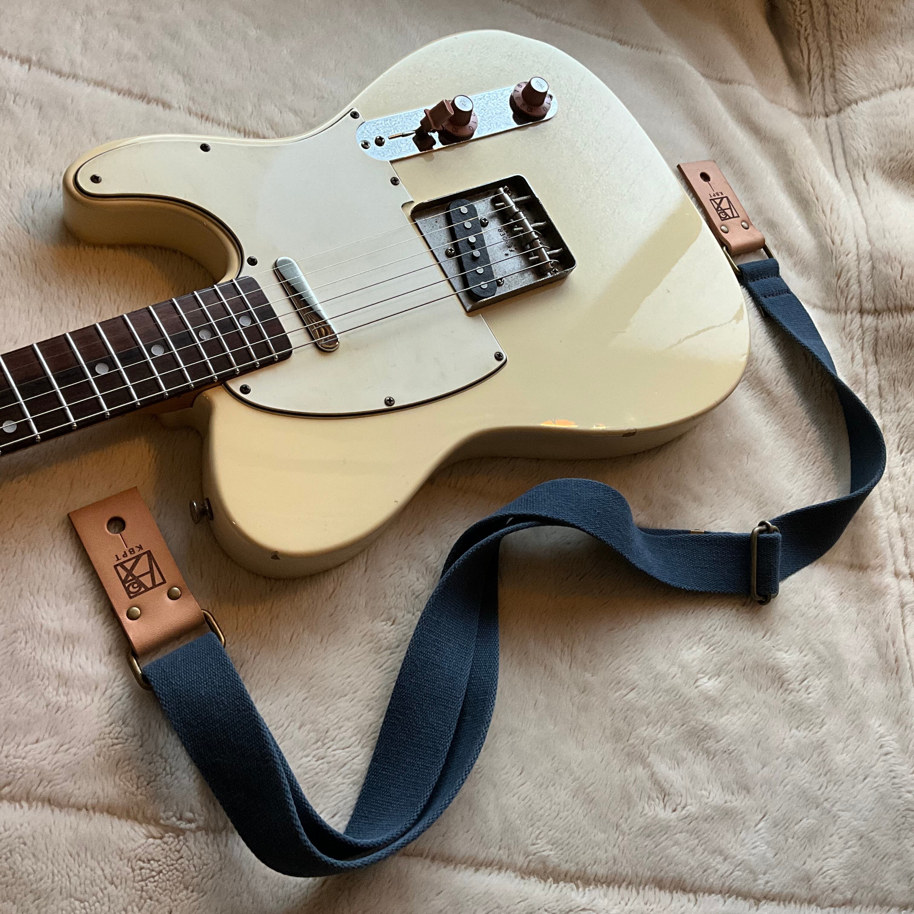 【llama40】アイアンブルー*エイジドベージュレザー*アンティーク金具【ピン径8mm/柔らかくて厚い綿のギターストラップ/ibabga1LM】