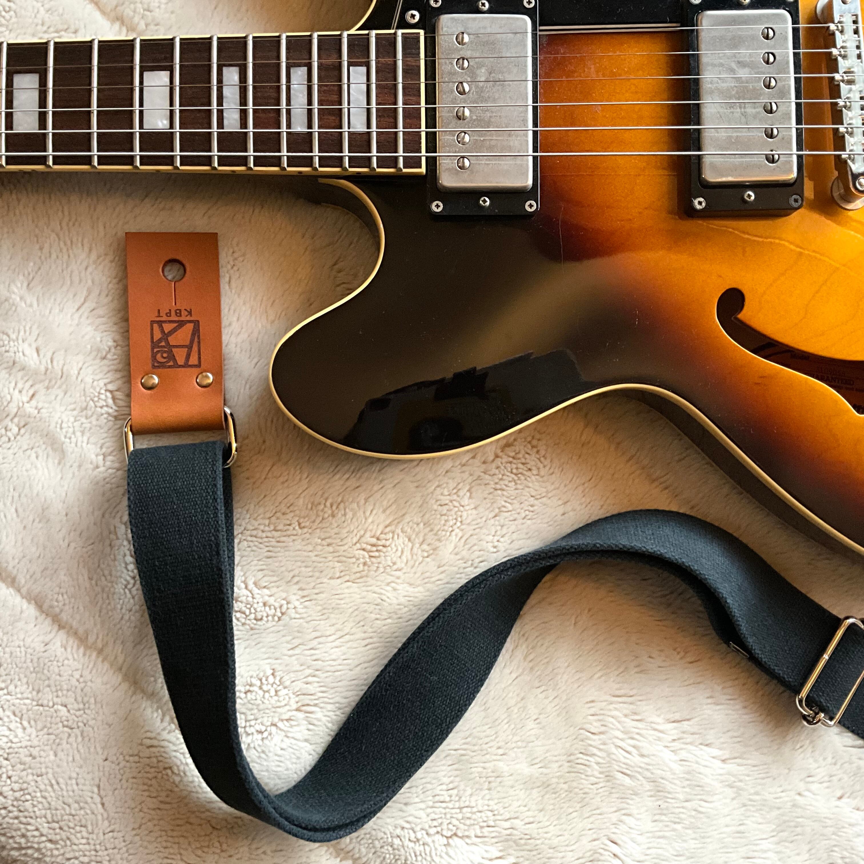 【llama40】チャコール*キャメルレザー*ニッケル金具【ピン径8mm/柔らかくて厚い綿のギターストラップ/cccmn2LM】